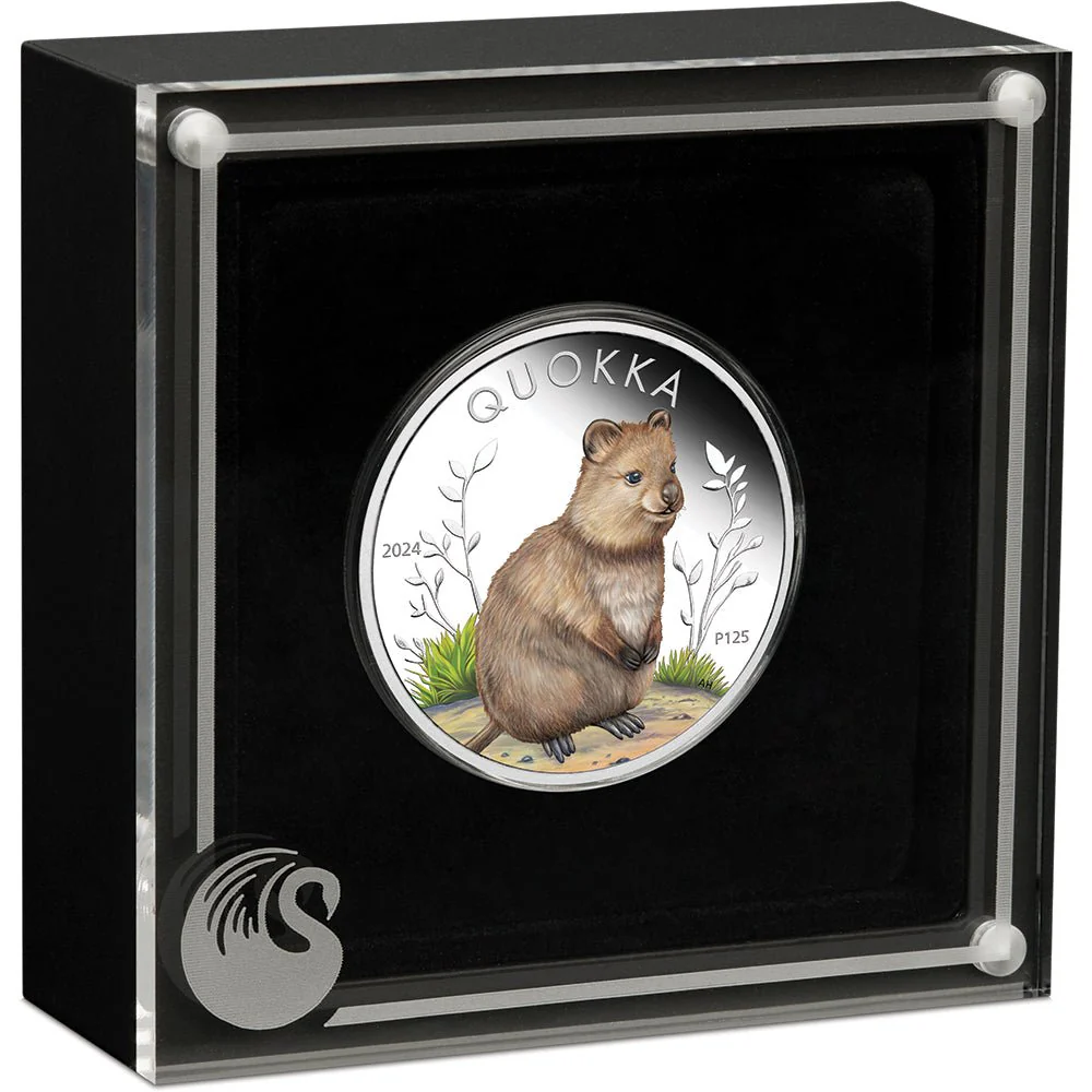 The coin’s coloured reverse portrays a happy looking quokka sitting on its hind legs among vegetation. Included in the design is the inscription ‘QUOKKA’, the 2024 year-date, and a ‘P125’ mintmark signifying The Perth Mint’s 125th anniversary.