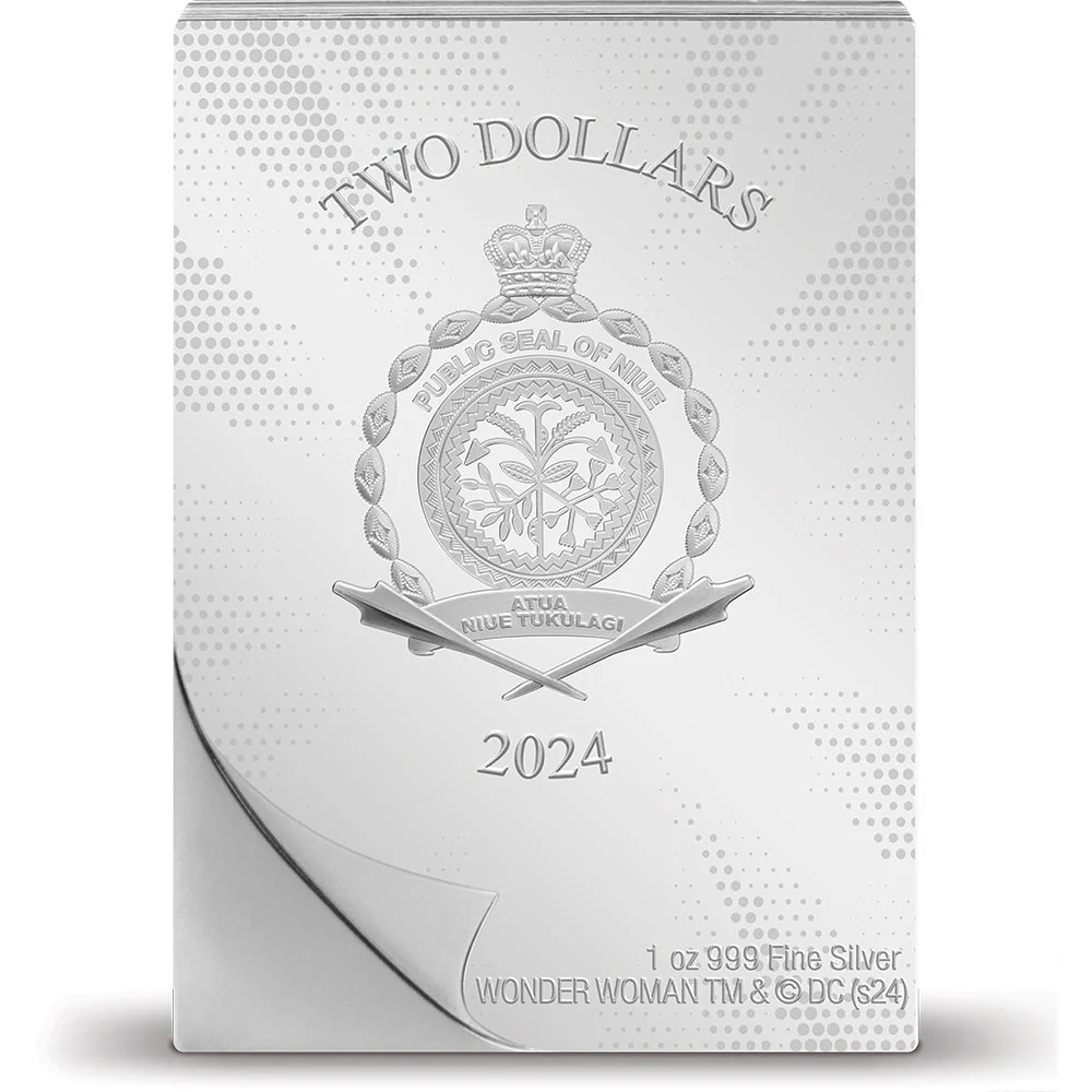 Presented in sleek, protective packaging with an image of WONDER WOMAN and a large display window. Includes a Certificate of Authenticity and the coin’s unique number.