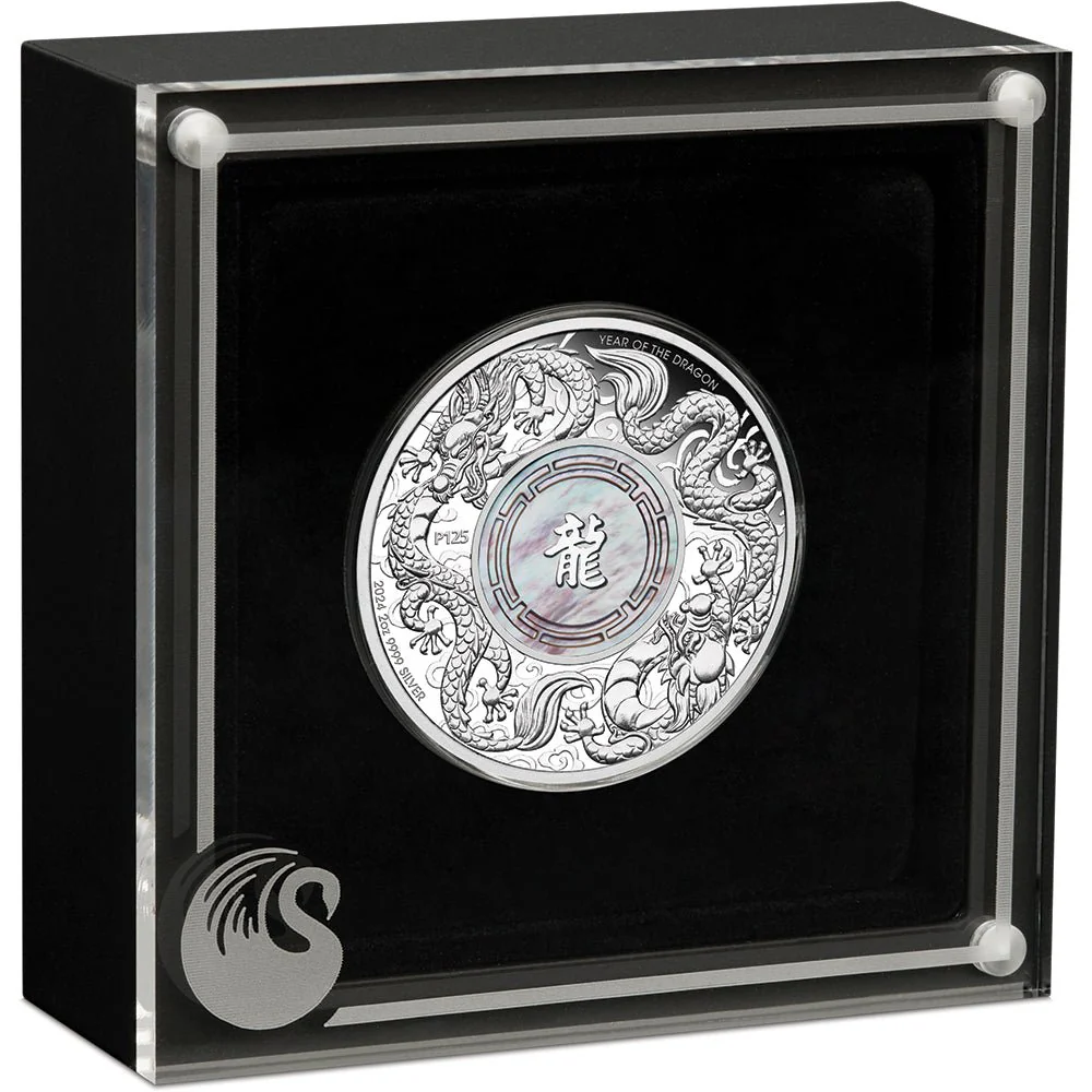 The coin portrays two dragons on a background of clouds, representing their heavenly realm. The mythical creatures surround a precision carved mother of pearl centerpiece featuring a three-dimensional sterling silver representation of the Chinese character for ‘dragon’. As well as the inscriptions ‘YEAR OF THE DRAGON’, the reverse includes a ‘P125’ mintmark signifying The Perth Mint’s 125th anniversary. Also included is the coin’s weight, purity, and year-date.