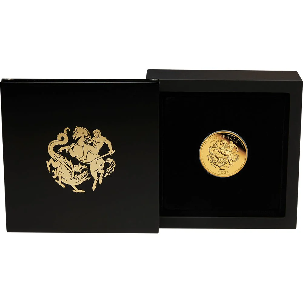 On the 125th anniversary of the first sovereign to be struck at The Perth Mint, this modern collectable re-imagines the famous design. The new work portrays a naked warrior on horseback brandishing a sword above a dragon. Each coin’s image appears within a decorative circle of raised dots, together with the inscription ‘AUSTRALIA’, ‘2024’, and a ‘P125’ mintmark.
