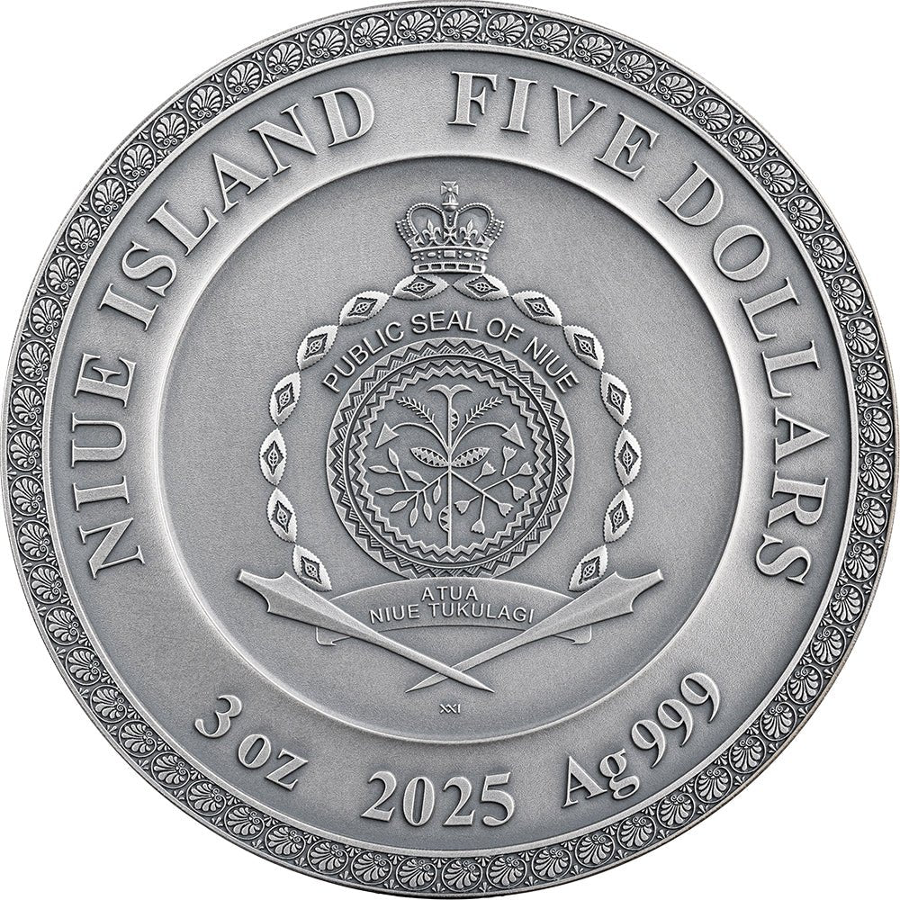 On this 3oz premium silver coin, Apollo’s noble visage emerges in stunning high relief, his flowing hair crowned with a laurel wreath — the symbol of eternal glory. A warm amber inset glows like the heart of the sun, while gilding highlights his celestial power.