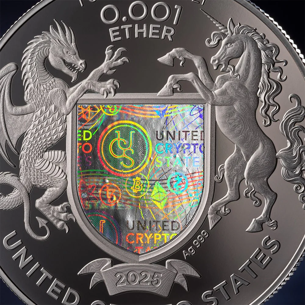 To mark a new chapter in digital evolution, this 1oz proof coin pays tribute to Ethereum — the world’s pioneering smart contract blockchain. Issued by the United Crypto States and denominated in 0.001 ETH, it bridges the precision of physical craftsmanship with the boundless potential of crypto.
