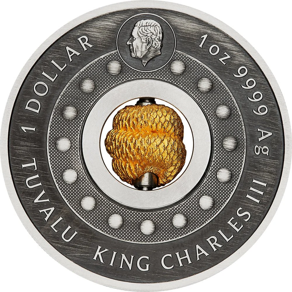 The coin incorporates a rotating gold-plated sterling silver bead resembling a coiled snake. It is surrounded by a representation of two snakes among stylised foliage. Also included is The Perth Mint's 'P' mintmark, and 2025 year-date.