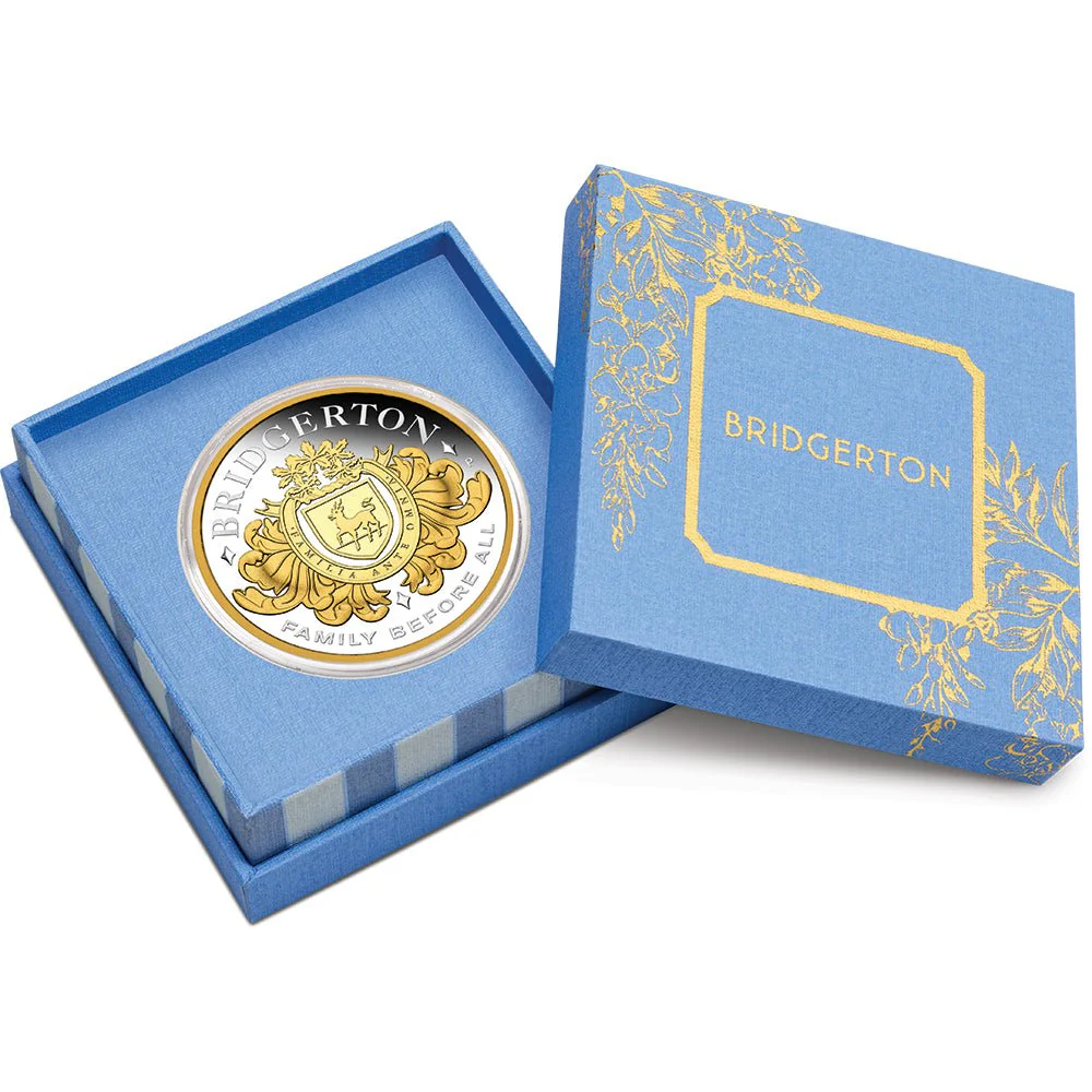 The coin portrays the Bridgerton family crest in 24-carat gilding, as well as the coin’s rims and serrated edge. Also in the design are the inscriptions “BRIDGERTON” and “FAMILY ABOVE ALL”, along with The Perth Mint’s ‘P’ mintmark.